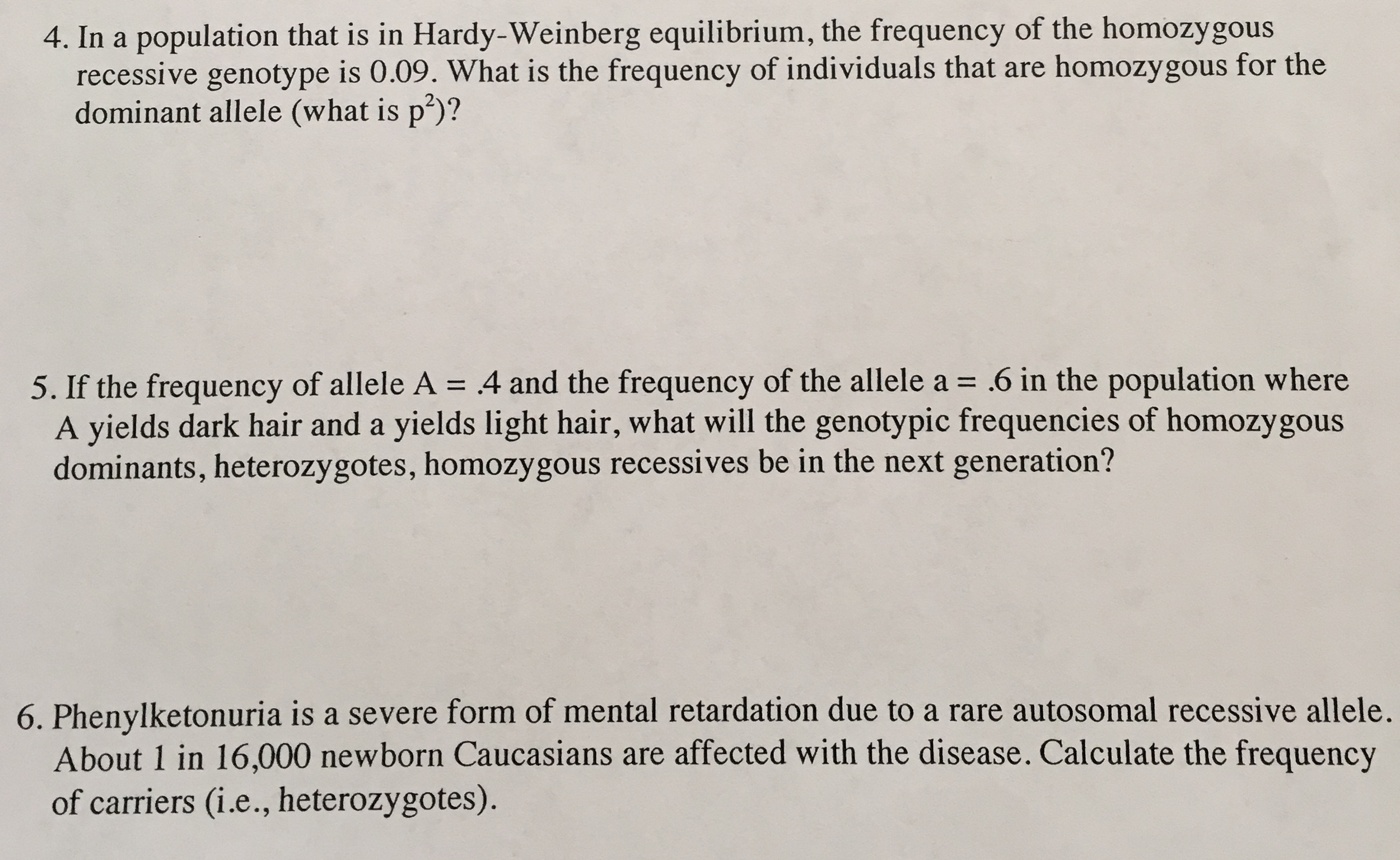 There must be random mating, no mutation, no migration, no natural selection, and a large sample size. What is the frequency of allele a 1 if we know that freq(a 1 a 1) = 0.10, and that the frequency of all heterozygote genotypes containing a 1 is 0.40. However if we know the actual frequency of the homozygotes (i.e. The frequency of the recessive allele in the population. Save as pdf page id 27919;